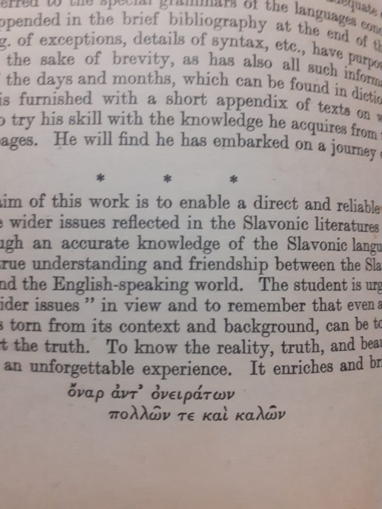 The ultimate aim of this work is to enable a direct and reliable approach to be made to the wider issues reflected in the Slavonic literatures and their background, through an accurate knowledge of the Slavonic languages, and so help to create true understanding and friendship between the Slav peoples, great and small, and the English-speaking world. The student is urged always to have those ‘wider issues’ in view and to remember that even an accurate translation, if it is torn from its context and background, can be totally misleading and distort the truth. To know the reality, truth and beauty of the Slavonic world is an unforgettable experience. It enriches and brings hope. (xxiv).